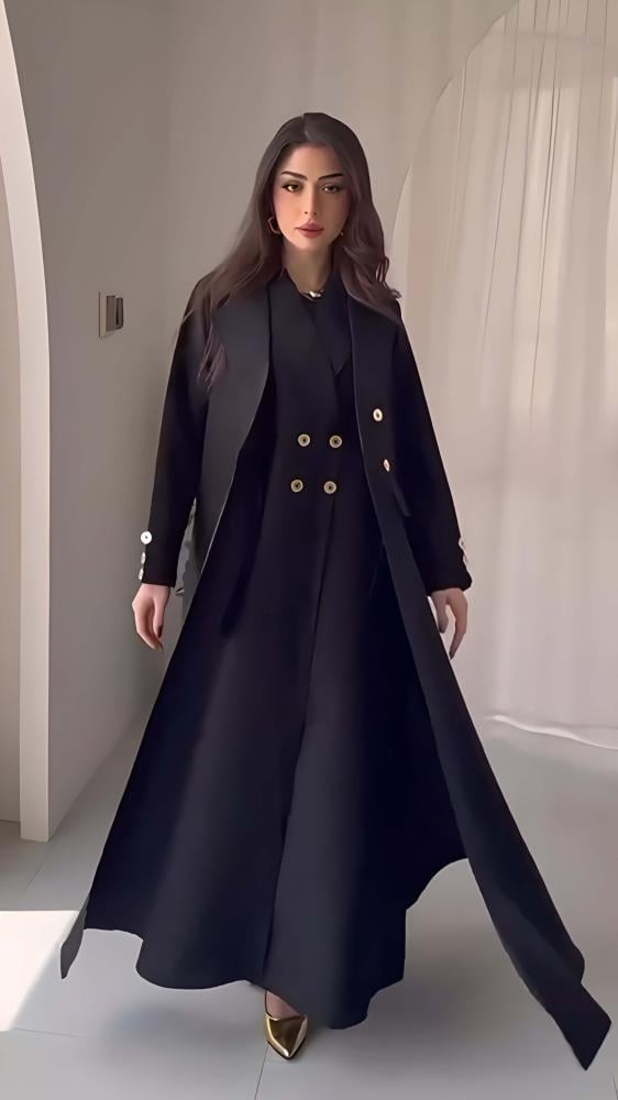 تصميمها مكوّن من قطعتين أنيقتين من قماش الكتان الفاخر، معروف بخفته وأناقة ملمسه. العباية تتميز بأزرار ذهبية أمامية ولمسات ملوكية على الأكمام، مستوحاة من الاستايل الملكي الراقي، وتعطيكي حضور قوي بكل مناسبة!